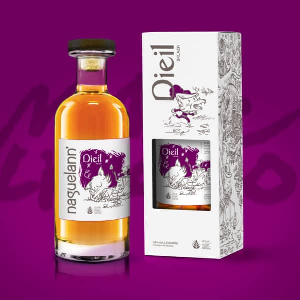 Ce whisky fait partie de la trilogie « Dieil » chez Naguelann, avec pour source une orge maltée tourbée à 35 ppm. Il séjourne dans des barriques très usées, afin de mieux se concentrer sur le Whisky en lui-même, et souligner la singularité de notre distillation.